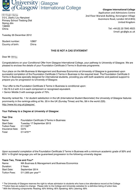 录取结果:英国格拉斯哥大学,3个学期预科完成后,衔接本科第二年,工商管理和商务经济学