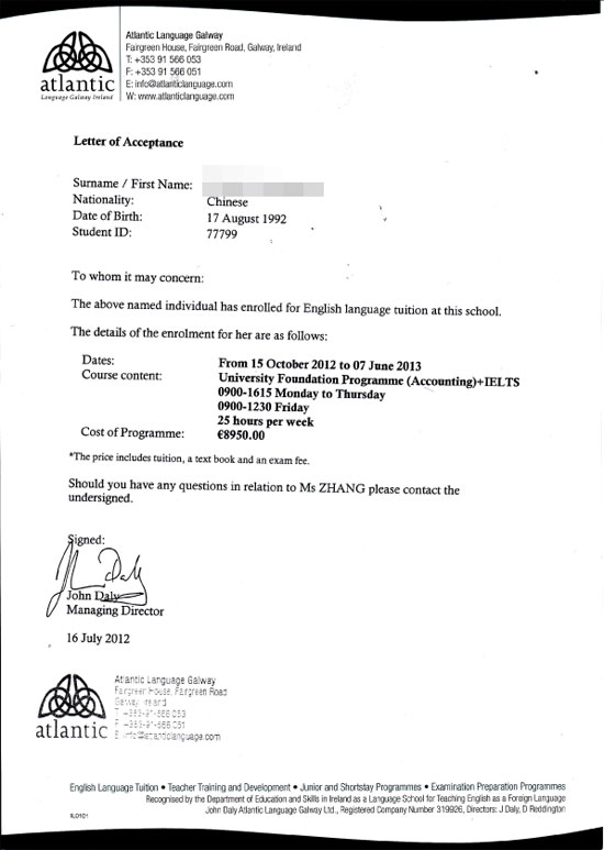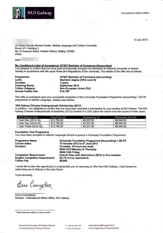 录取结果:爱尔兰国立高威大学会计专业,3年本科